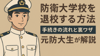 防衛大学校 防衛大学校を退校する方法|手続きの流れと裏ワザを元防大生が解説 防衛大学校を退校するための具体的手順を解説。お客様期間のポイント、スタンプラリー、官品返却、面談、転出手続きまで元防大生の実体験付き。 2025.01.08 防衛大学校防衛大学校の闇
