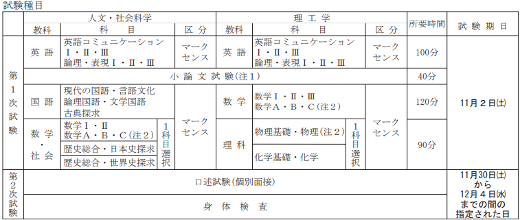 防衛大学校の採用試験は、文系・理系どちらとも、国公立であるにもかかわらず私立型の三教科受験であり、試験科目は下の図のようになっています。