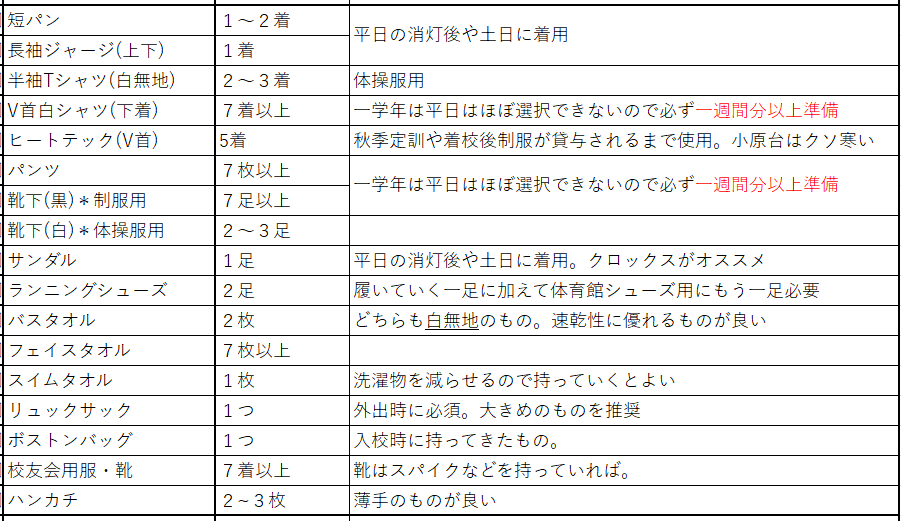 次に、半袖Tシャツは、体育用の白無地のものを2~3着、校友会用のものを一週間分(最低7着)用意してください。