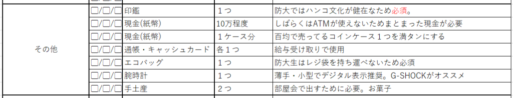 ジャンル間に自由記入欄を設けてあるので、説明会等で他に必要物品ができたら書き込むなりしてください。