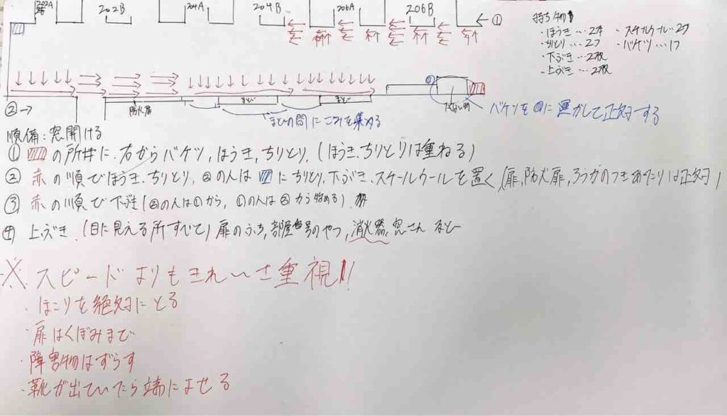 この申し送りが終わったら、自身で何度もメモを見返すなどして清掃用具や清掃手順を完璧に叩き込んで清掃に臨みます。