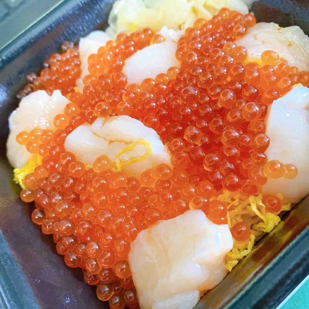 写真をのせたホタテいくら丼も、ネタ大盛にすることでいくらとホタテの量がかなり増えるので、200円追加で払うのはオススメです!